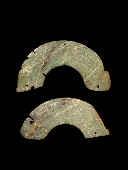 each large, thick pendant decorated on both sides with incised double-line meander of hooked, spurred and curled scroll motifs below a narrow segmented ‘backbone’ incised on the outer rim, the larger pendant with a horned dragon head carved in silhouette at one end, detailed with incised outlines of large eyes, ‘D’-shaped ears and short limbs, the opposite end simply carved as a curled tail, the companion pendant following the same plan but with less detail, the dragon’s head indicated by a round eye and a blunt snout at one end, the tail at the opposite end indicated by a tightly curled hook, both pendants pierced for suspension with holes at the center of the outer rim and both ends, carved from olive green jade with natural passages of dark brown and pale tan mottling, with traces of encrusted earth and cinnabar.