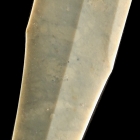 the thinly carved blade of slender elegant unusual form, with sharp beveled cutting edges, both sides curving down in slightly different arcs and widening to very shallow angle-points where the beveled edges end and the blade immediately tapers more rapidly, ending in a narrow skewed point, with a very gently rising median crest extending from the bottom of the plain squared tang through the drilled hole at the top of the blade down to the tip, the pale green and buff mottled stone smoothly polished all over.