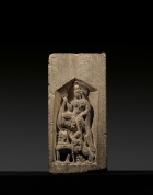 carved with figures in deep niches on two sides, the larger niche with a meeting of the bodhisattvas Manjusri (Wenshu) on a lion and Samantabhadra (Puxian) on an elephant, and with the Seven Buddhas of the Past seated on lotus pods shown floating in the air between the bodhisattvas, the foreground with a muscular foreign attendant standing beside the lion and a slender female adorant holding a lotus bud standing beside the elephant, all carved in high relief with long dedicatory inscriptions on the vertical borders; with another niche on one narrow side adjacent to the principal niche, carved in relief with a figure of Manjusri (Wenshu) on a lion attended by a muscular foreigner, and with a dated dedicatory inscription on one vertical border, the solid block of dense gray stone with weathered surface.