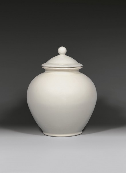 of well potted ovoid form with steeply rounded high shoulders surmounted by a short concave neck with wide mouth and rolled-out lip, the plain sides tapering to a solid foot with narrow beveled edge, the cover of shallow domed shape with flat splayed rim and bud-shaped knop, the inner flange of the cover very well fitted to the mouth of the jar, the jar and cover with a glossy transparent glaze on both the interior and exterior, the glaze very well controlled and extending all the way down to the edge of the foot, the flat base of the jar and the inner rim of the cover left unglazed revealing the dense white porcelaneous body.